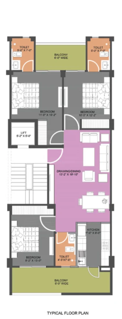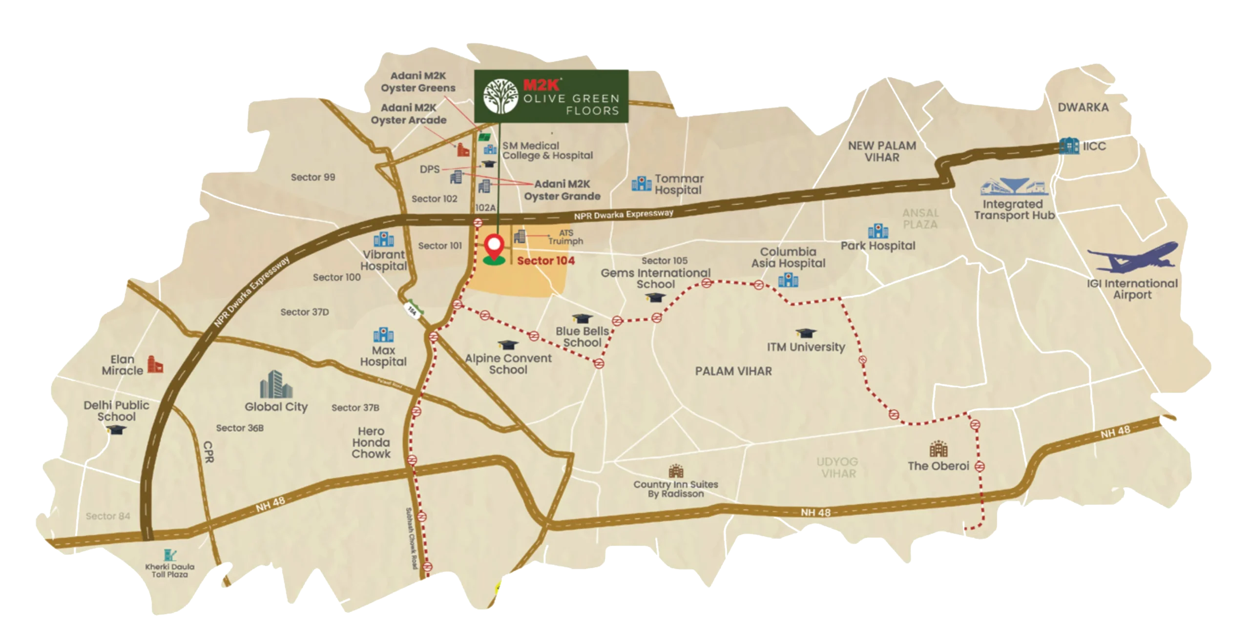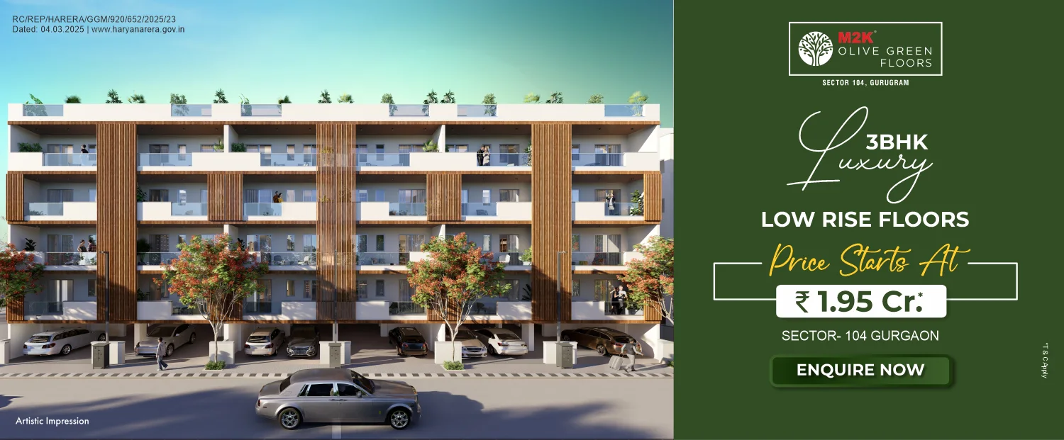 The M2K Olive Green Floors is a premium residential development within the M2K Olive Greens DDJAY Colony located in Sector 104, Gurugram. Its prime location near the Dwarka Expressway ensures excellent connectivity making it a highly desirable area. Comprising of luxury 3 BHK floors, parking slots at stilt with 4 floors & large balconies and terrace, the project offers a blend of modern living, convenience and accessibility for a contemporary lifestyle. Designed to maximize natural light and ventilation, each unit provides a serene and comfortable atmosphere. M2K Olive Green Floors combines modernity, comfort and sustainability, offering an ideal living experience.